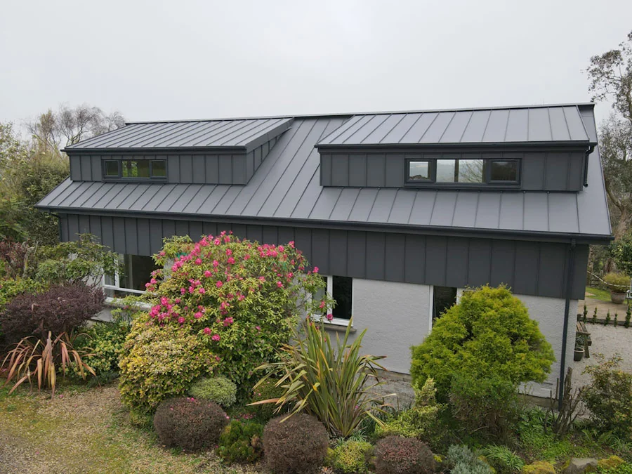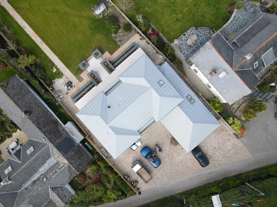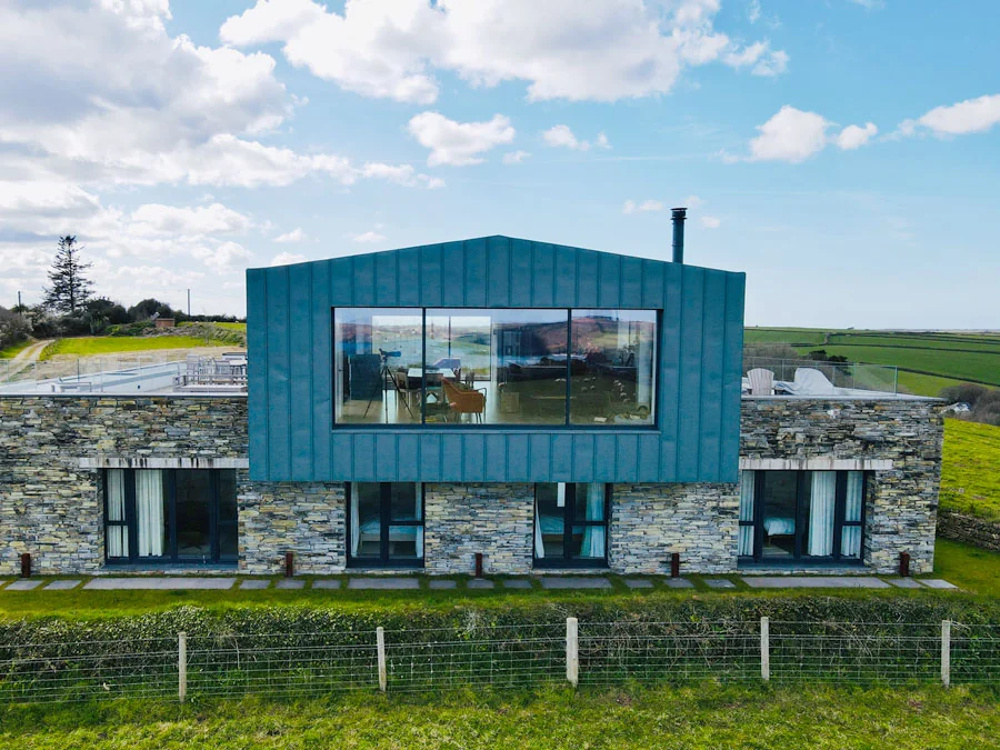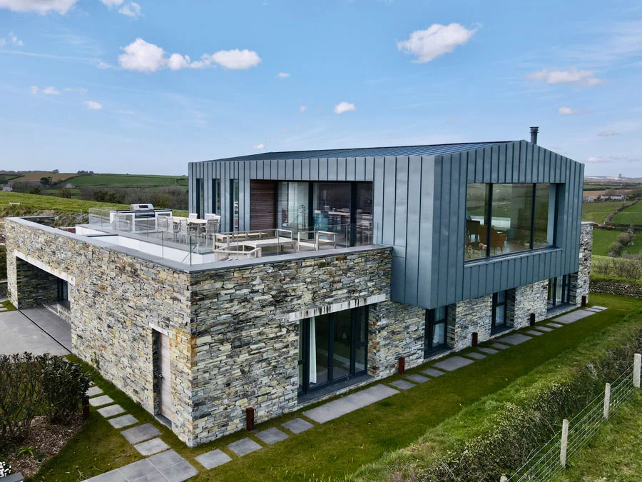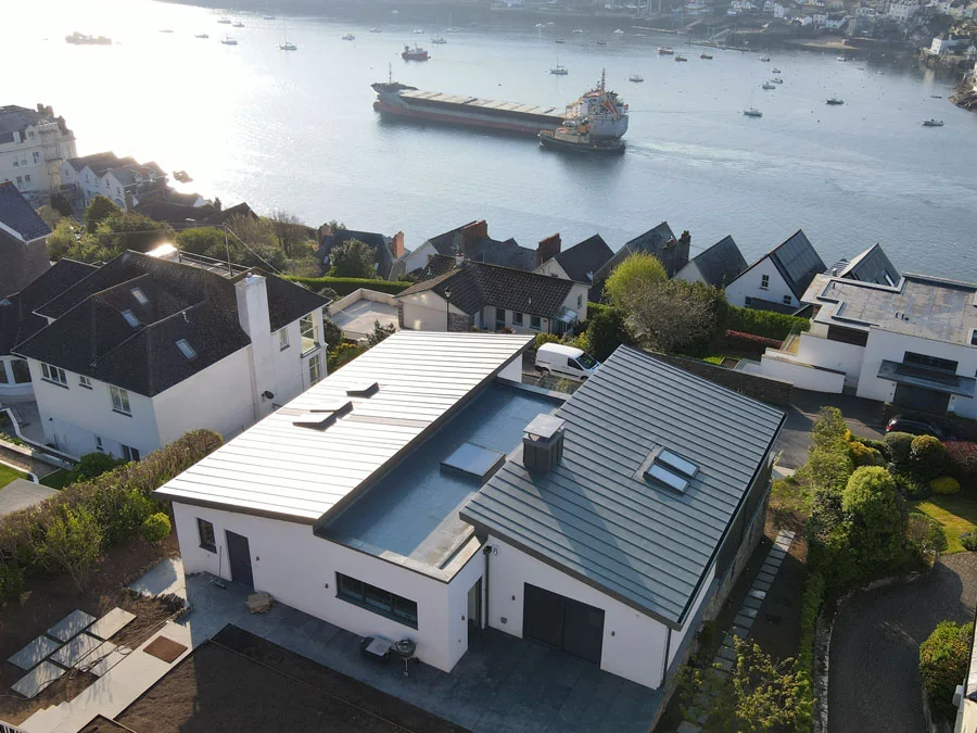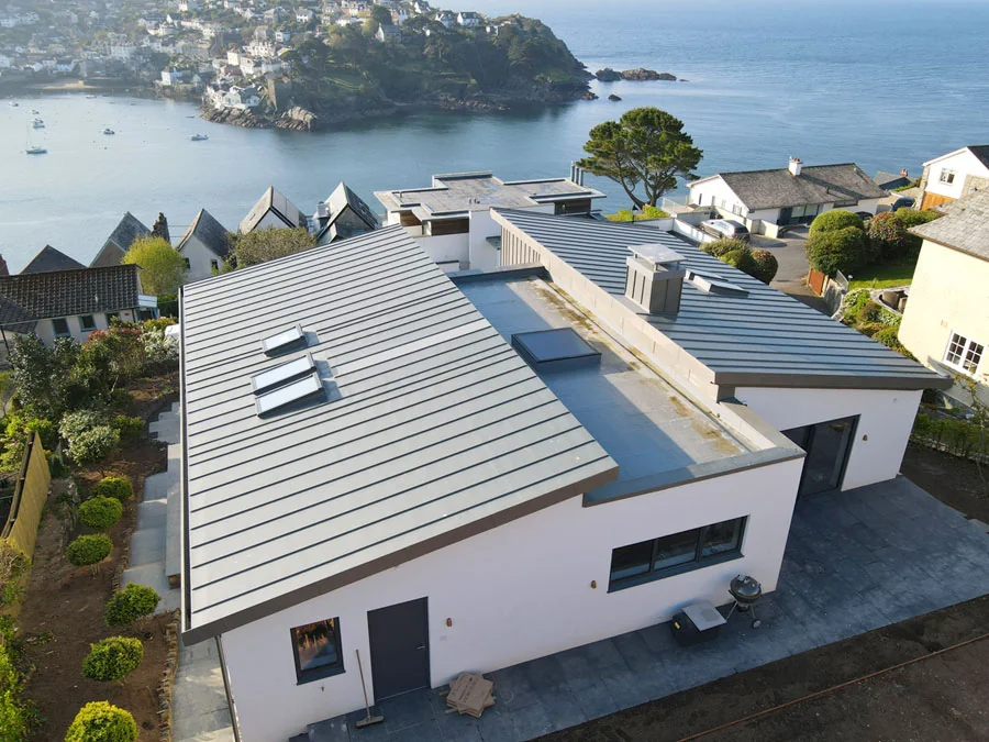 Bespoke standing seam zinc roof on a contemporary coastal home in Cornwall.